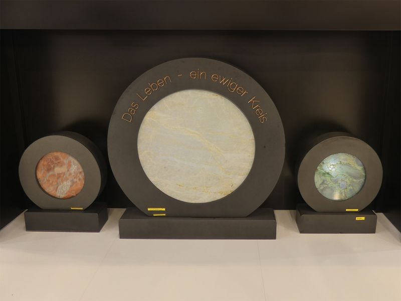 Ihre kreisrunde Form stellt symbolisch das Tor in neue Universen in ihr Zentrum. Sie spricht eine moderne Designsprache. Das Novum befindet sich im Kreisinneren des Modells: Dünnstein! Die Schönheit des Gesteins, die tagsüber durch das natürliche Licht erstrahlt, erleuchtet dank möglicher externer Lichtquelle auch am Abend und in der Nacht die Grabstätte.