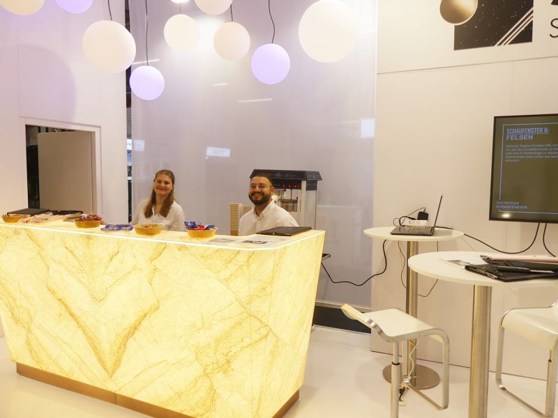 Weitere Highlights am Stand waren unsere hinterleuchtete Steintheke aus Dünnstein und das neue Material „Borealis Light“.