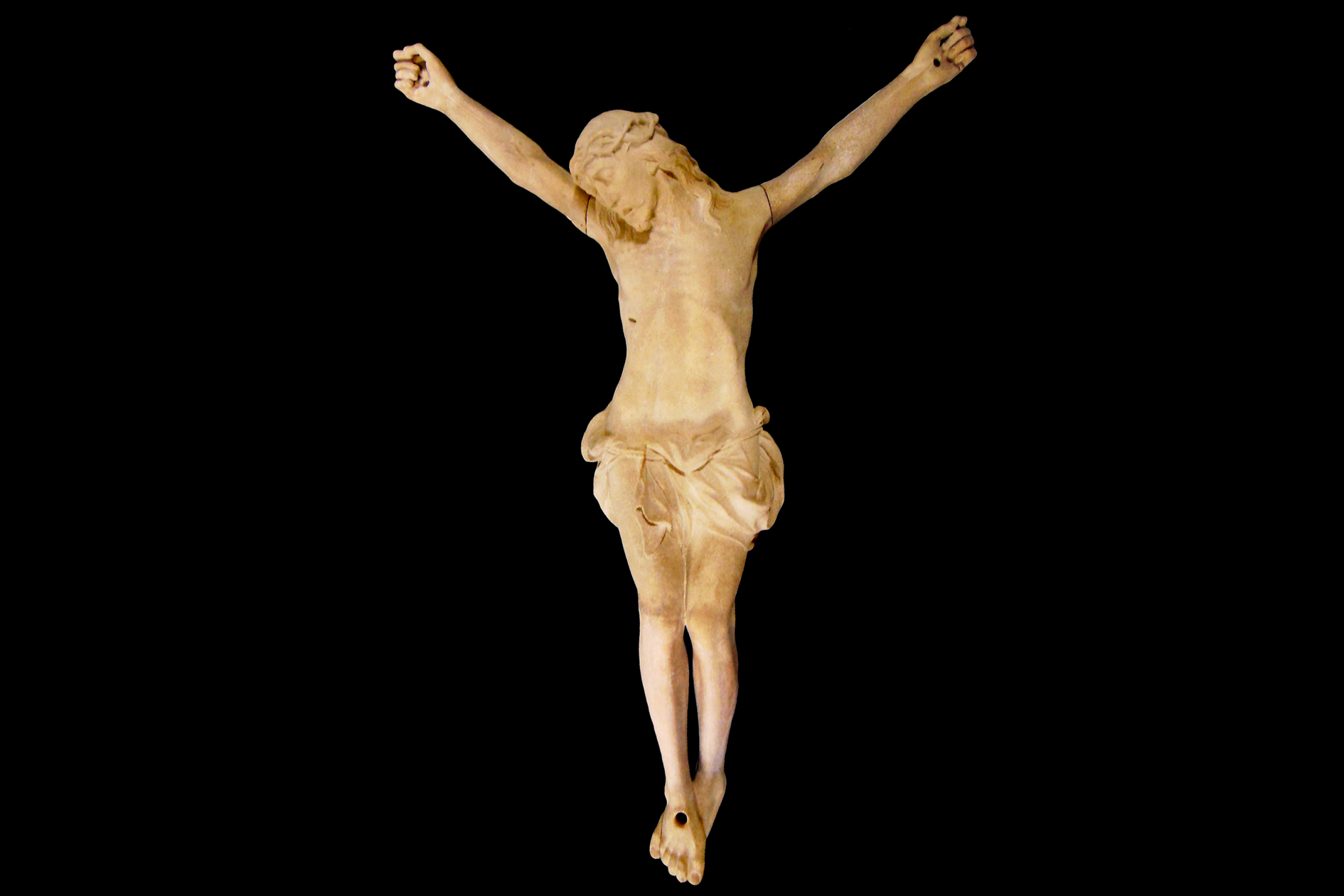 Arbeiten | Restaurierung der Jesusfigur mit vorhandener Substanz Rekonstruktion von Arm und Bein in Vierungstechnik mit Steinergänzungsmörtel Rissverpressung mit Mikrozement |