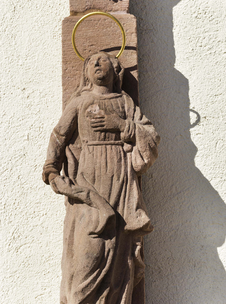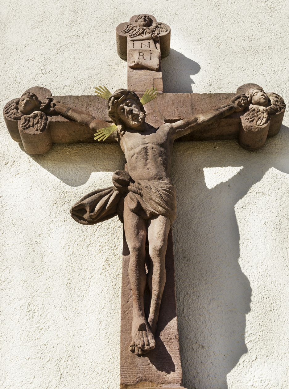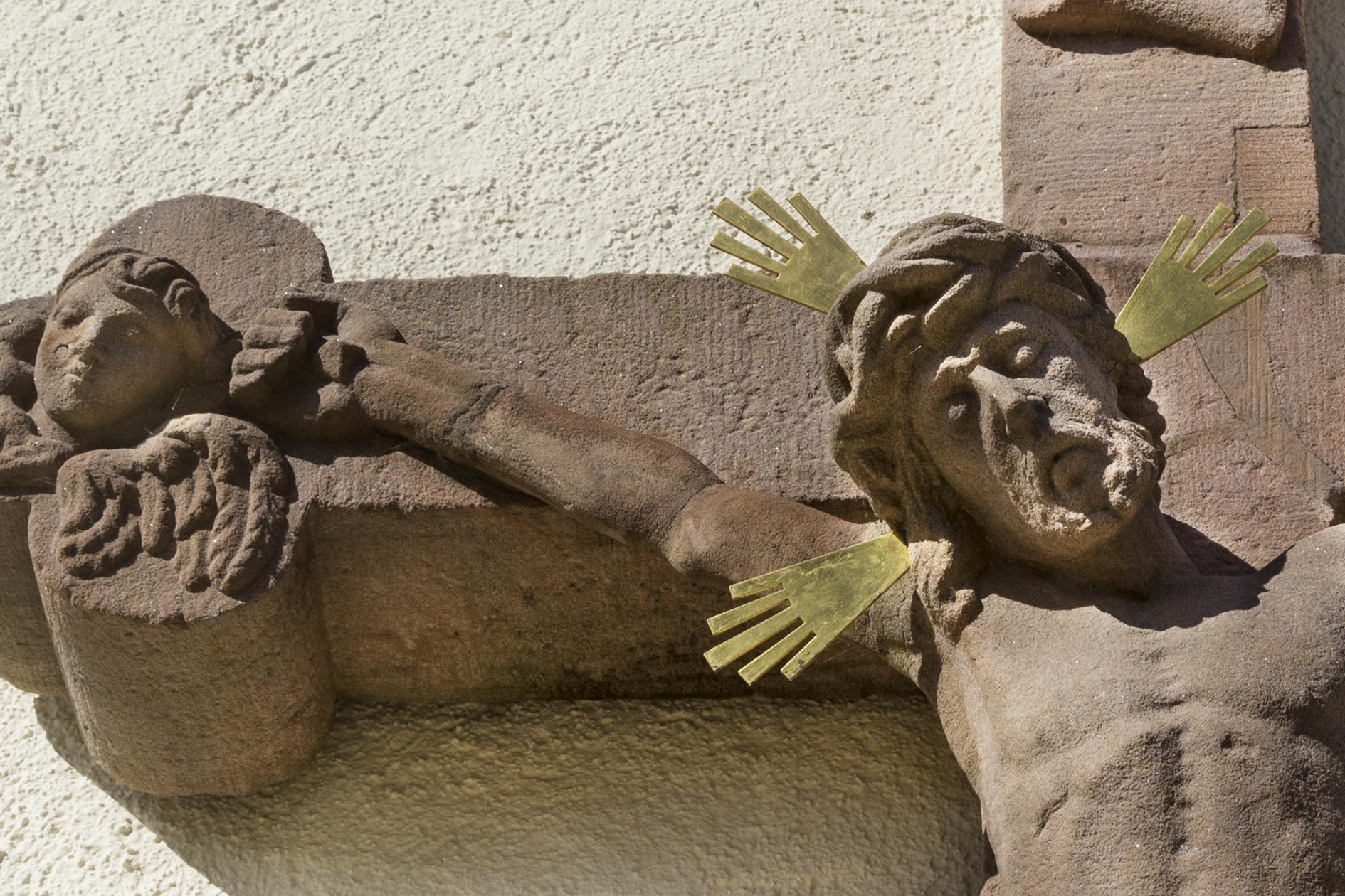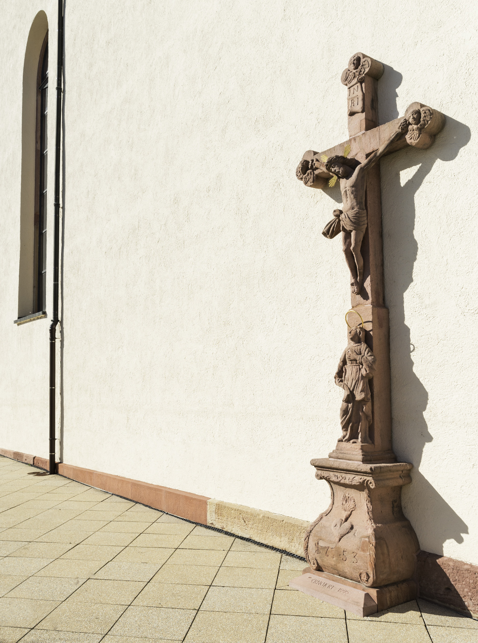 Das Kruzifix an der Außenfassade der Kirche war von der Witterung stark gezeichnet. Jogerst restaurierte das Feldkreuz mit Lahrer Buntsandstein und gab ihm so seine ursprüngliche Ausstrahlung zurück.
