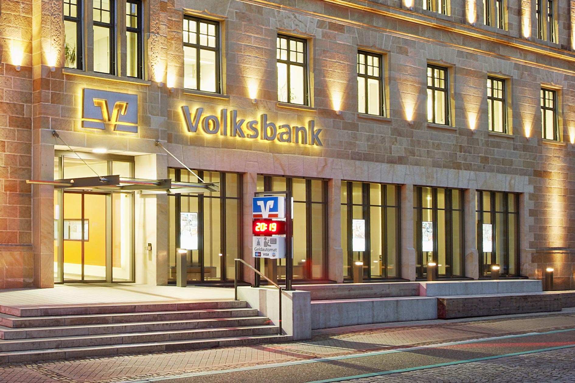 Im Rahmen der Restaurierung der kompletten Außenfassade der Volksbank in Offenburg erfolgte auch die Umgestaltung des Eingangsbereichs um die Schaufenster herum.