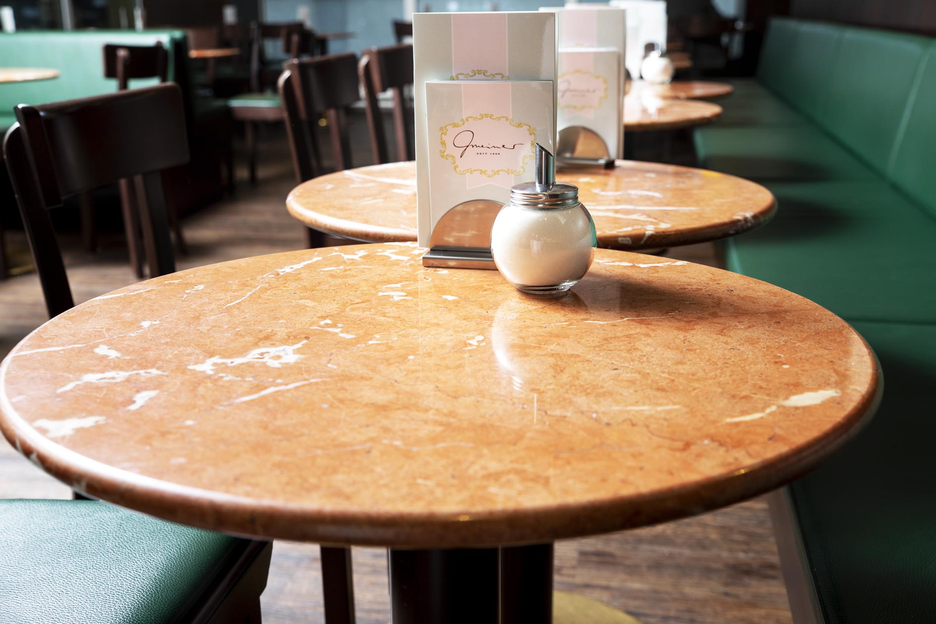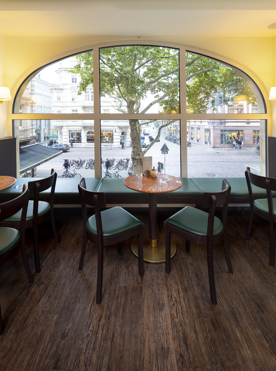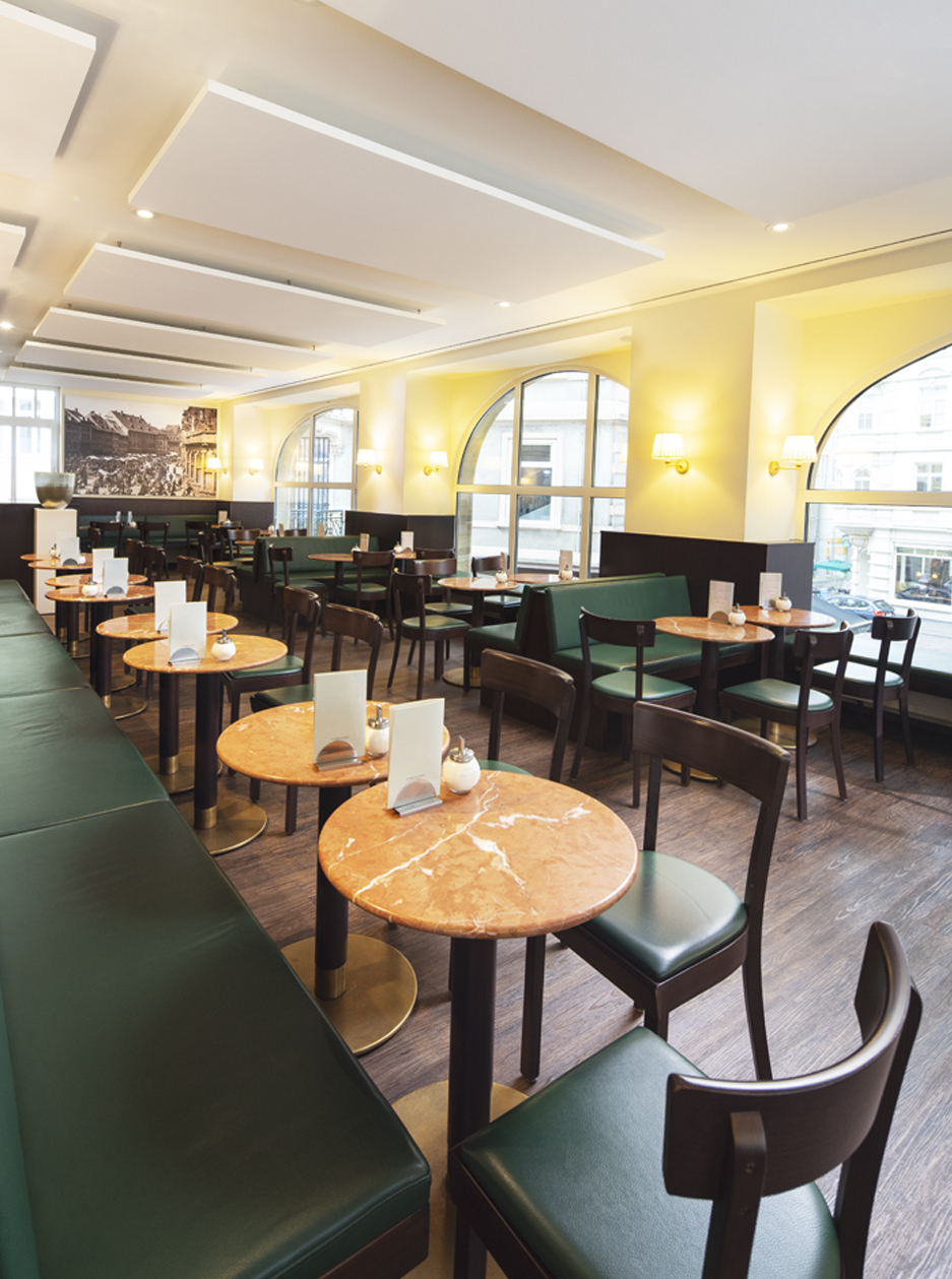 Der edle rote Kalkstein aus Spanien setzt einzigartige Akzente und erzeugt im Zusammenspiel mit der vornehmen Einrichtung und der historischen Architektur eine behagliche Atmosphäre klassischer Caféhauskultur. Der einheitliche Einsatz eines Materials für die Tische, den Objekt- und Ladenbau im Servicebereich und die Waschtische in den Toiletten, erzeugt eine konsequente Gestaltungslinie und trägt eine freundlich-elegante Lebendigkeit durch das ganze Gebäude.