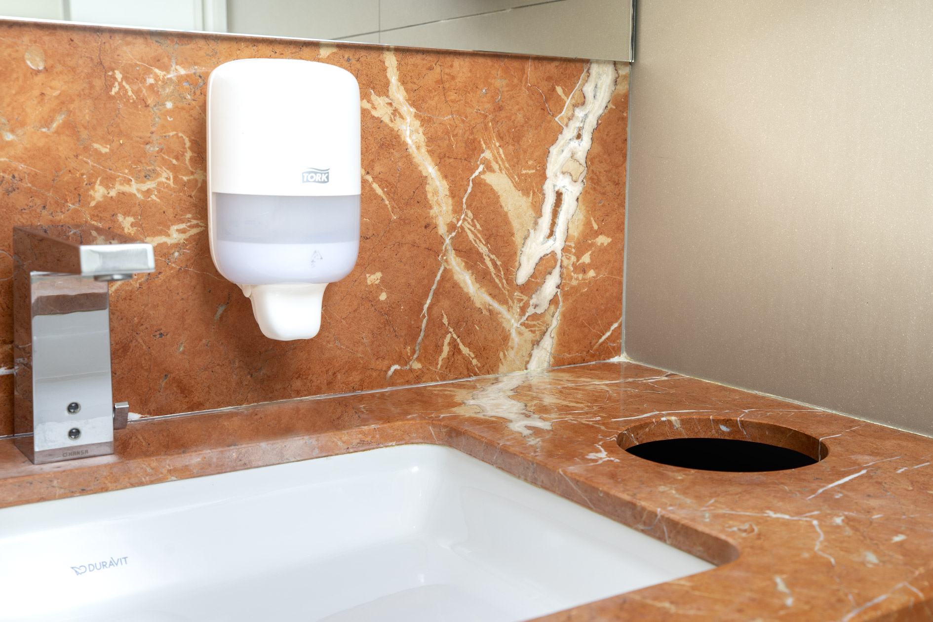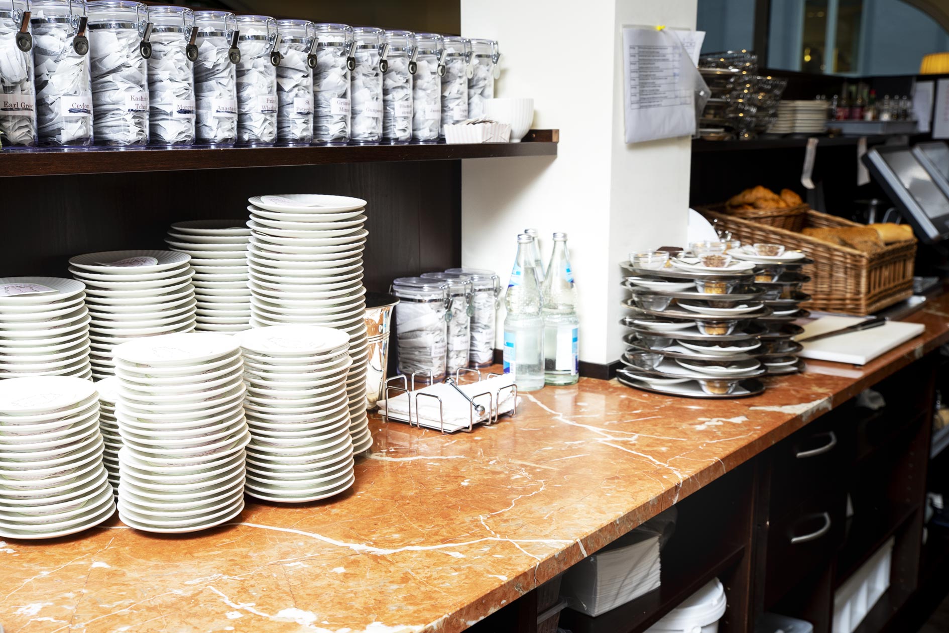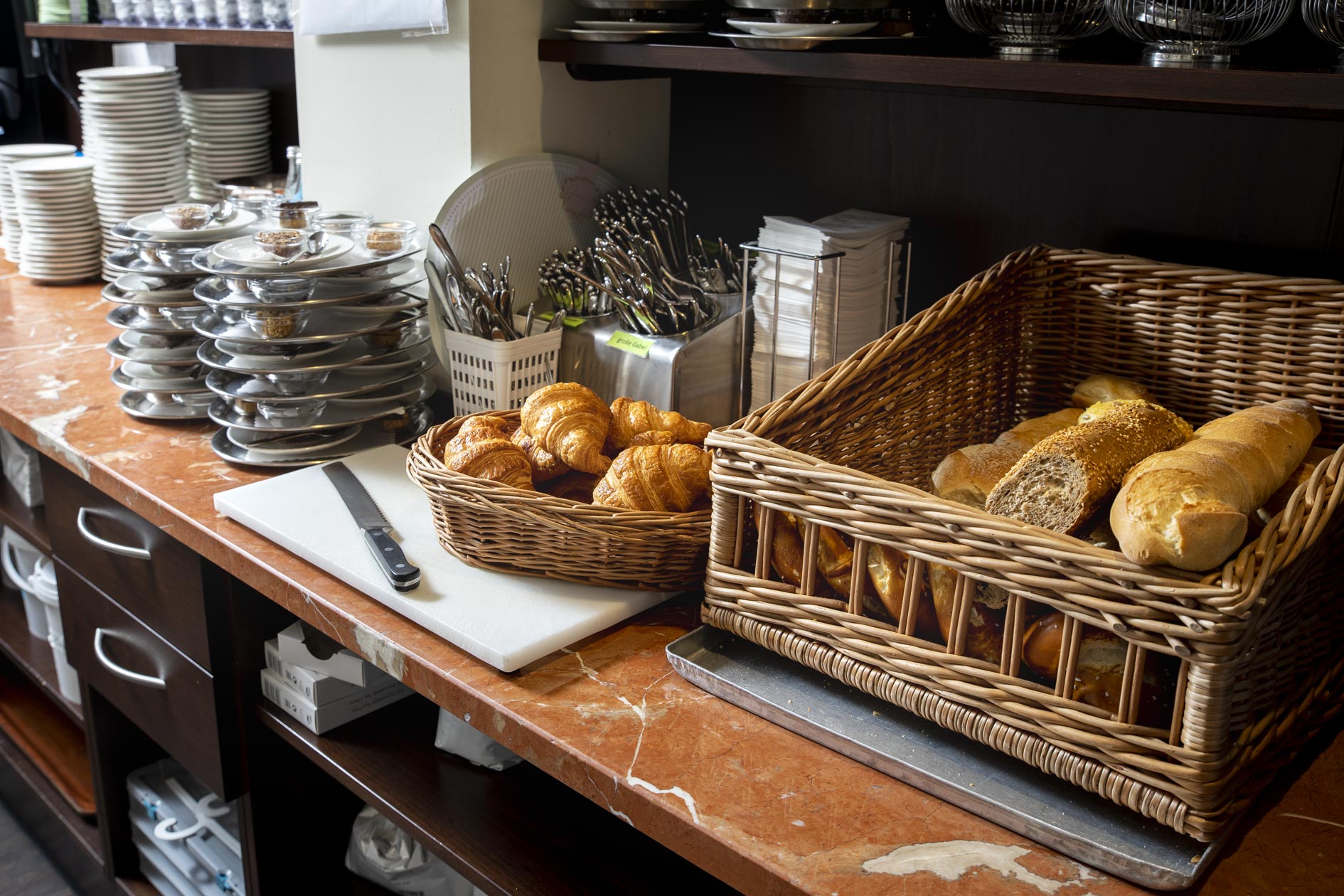 Der edle rote Kalkstein aus Spanien setzt einzigartige Akzente und erzeugt im Zusammenspiel mit der vornehmen Einrichtung und der historischen Architektur eine behagliche Atmosphäre klassischer Caféhauskultur. Der einheitliche Einsatz eines Materials für die Tische, den Objekt- und Ladenbau im Servicebereich und die Waschtische in den Toiletten, erzeugt eine konsequente Gestaltungslinie und trägt eine freundlich-elegante Lebendigkeit durch das ganze Gebäude.