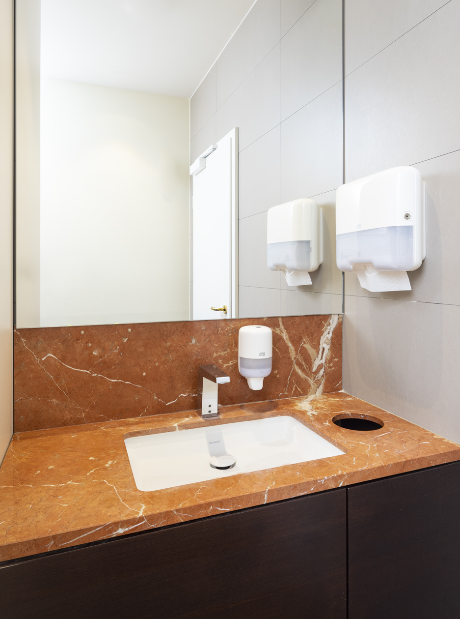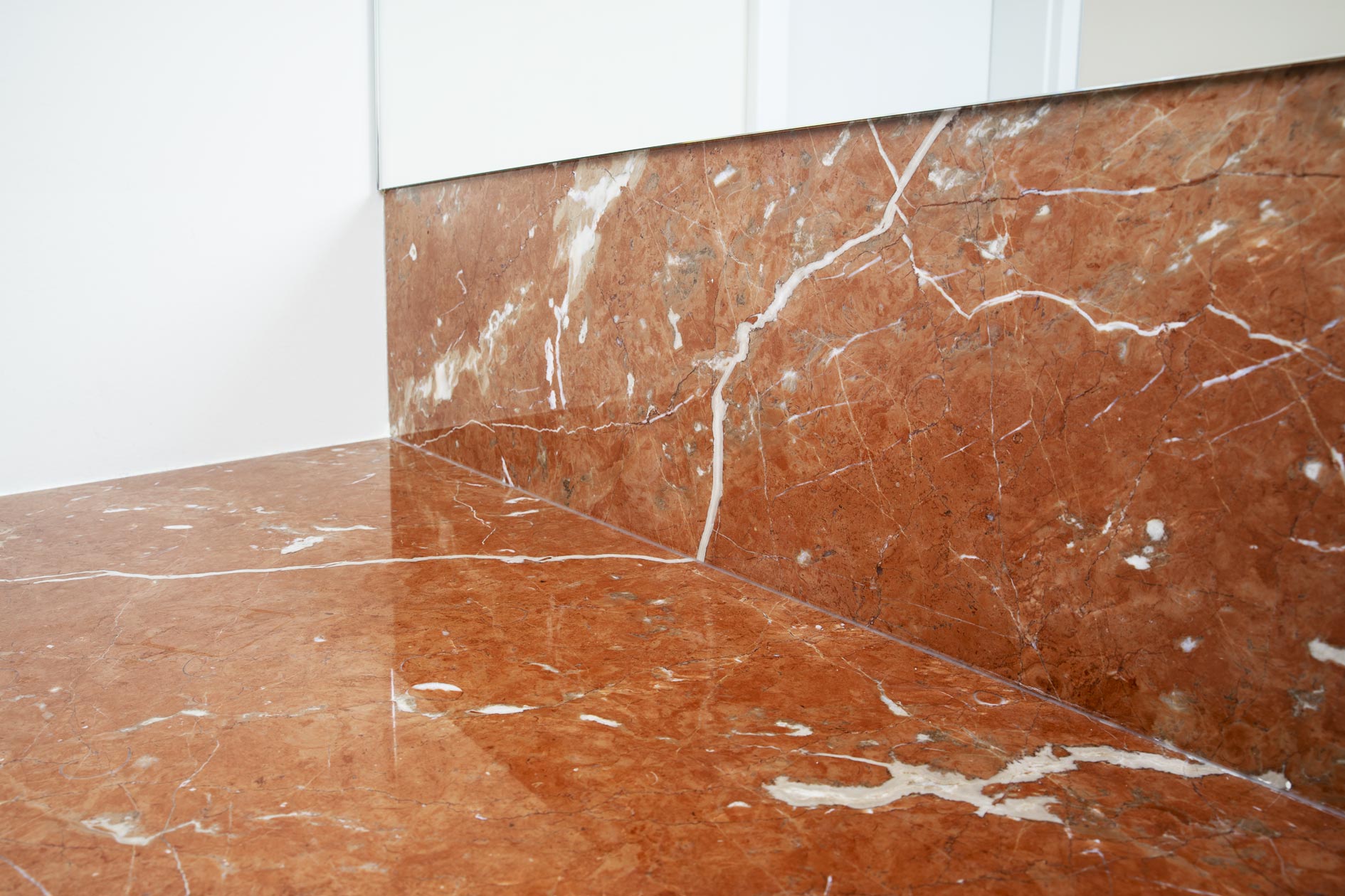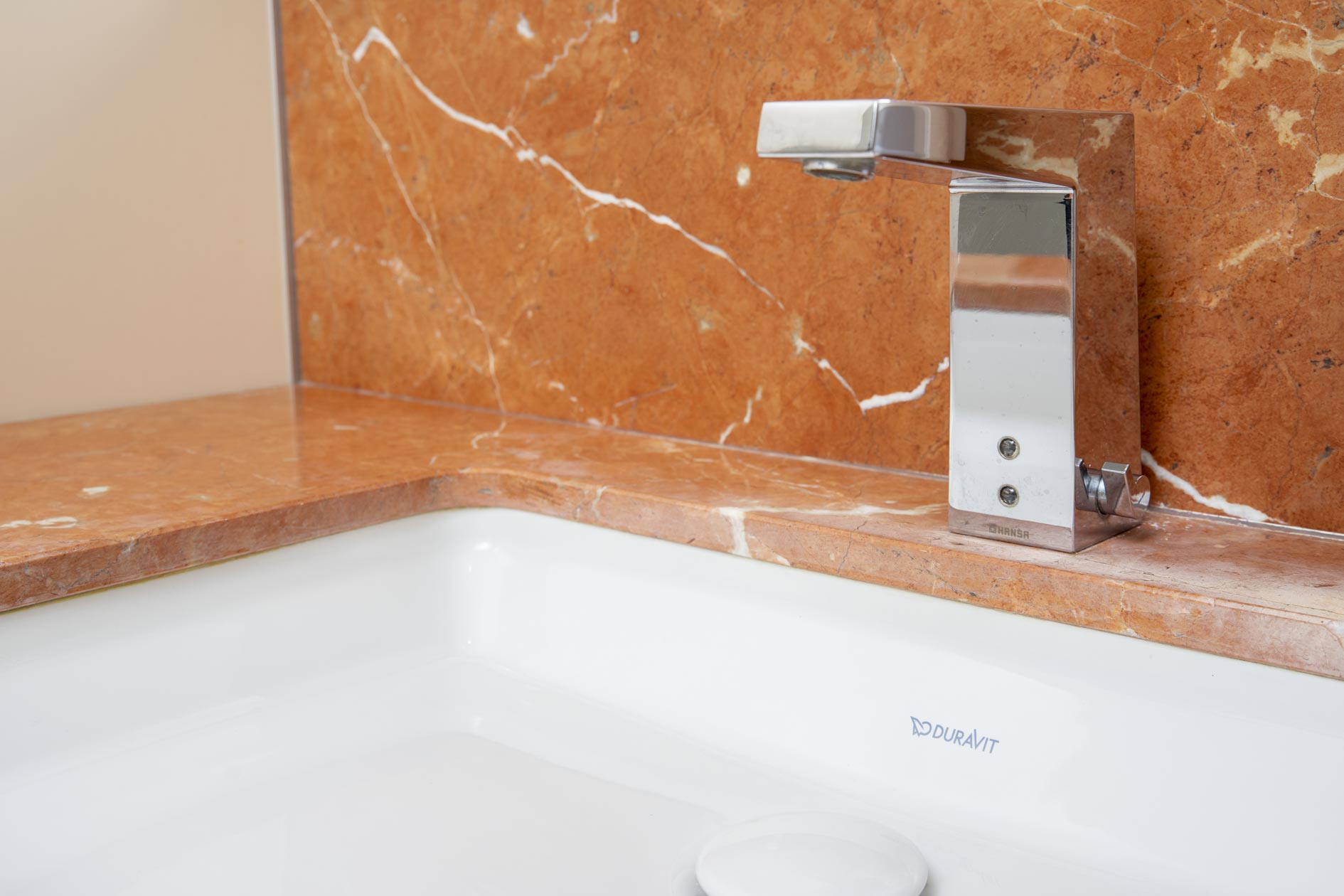 Die polierten Innenkanten des Handtuchabwurfs und das unterbaute Waschbecken geben dem Stein den Raum, seine volle Wirkung zu entfalten.