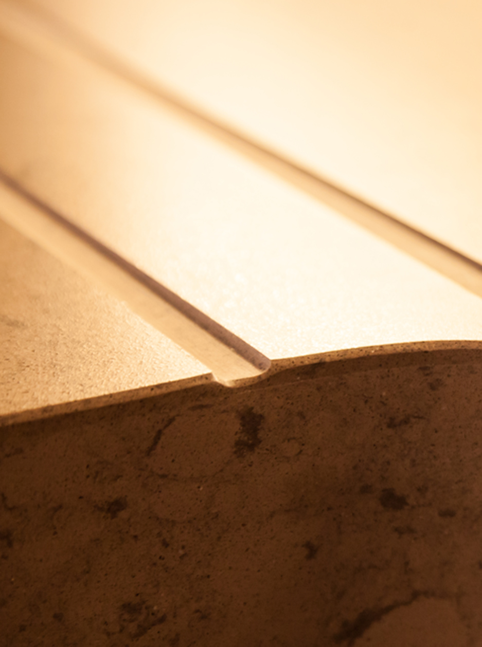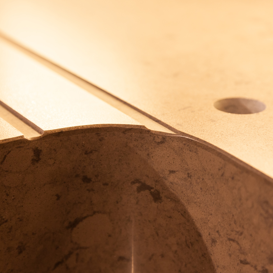 Verarbeitung | Fugenlose Verklebung des Beckens Einarbeitung von Abtropfrillen in die Oberfläche nahtloser Übergang ins Becken Becken einkleben und überschleifen |