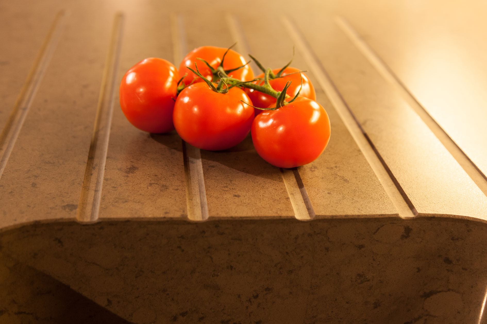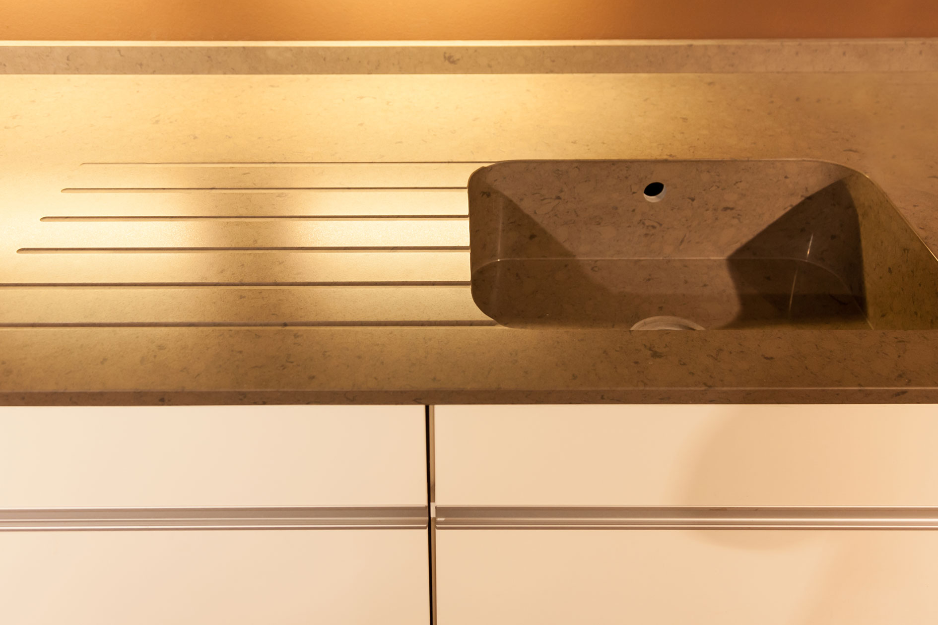 Die Küchenarbeitsplatte mit integriertem Spülbecken und nahtlosem Übergang ins Becken der Abtropfrillen wirkt durch seine Einheitlichkeit sehr schlicht und edel. Das Material Silestone (Quarzkomposit), ein künstlich hergestellter Stein, ermöglicht es durch fugenlose Verklebung, das Spülbecken aus demselben Material wie die Arbeitsplatte herzustellen – ein Gestaltungselement, das elegant und alltagspraktisch zugleich ist.